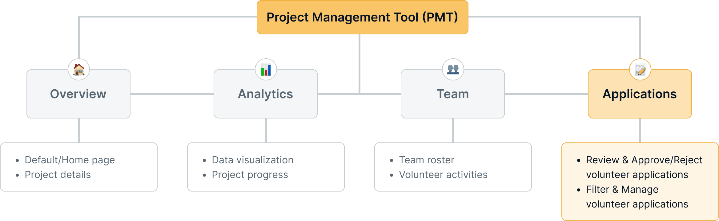 After analyzing users' main pain points, we brainstormed and formulated How Might We questions to address them. We grouped related questions into three themes and assigned each team member to tackle one set. I focused on solving pain points related to volunteer application management.: