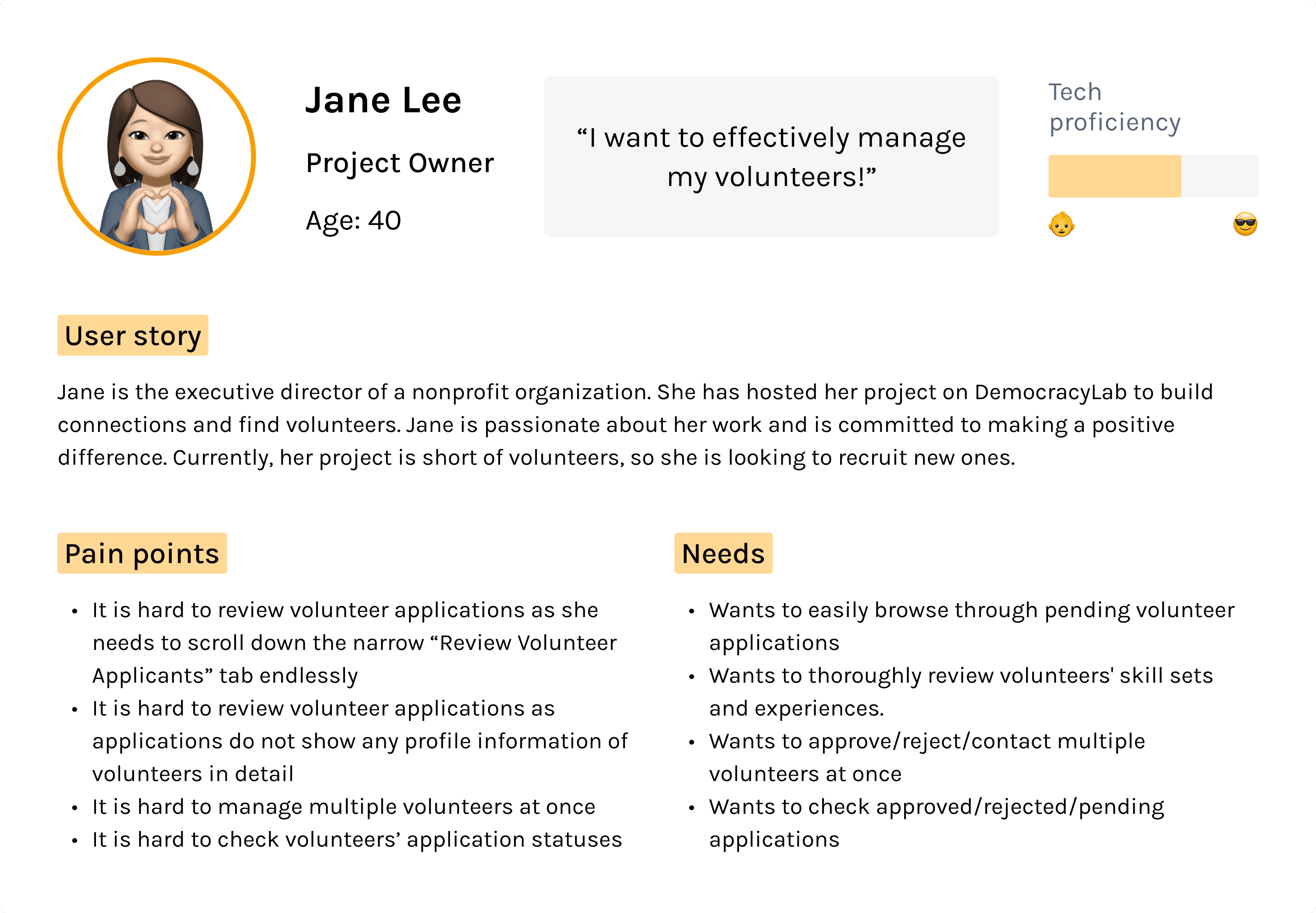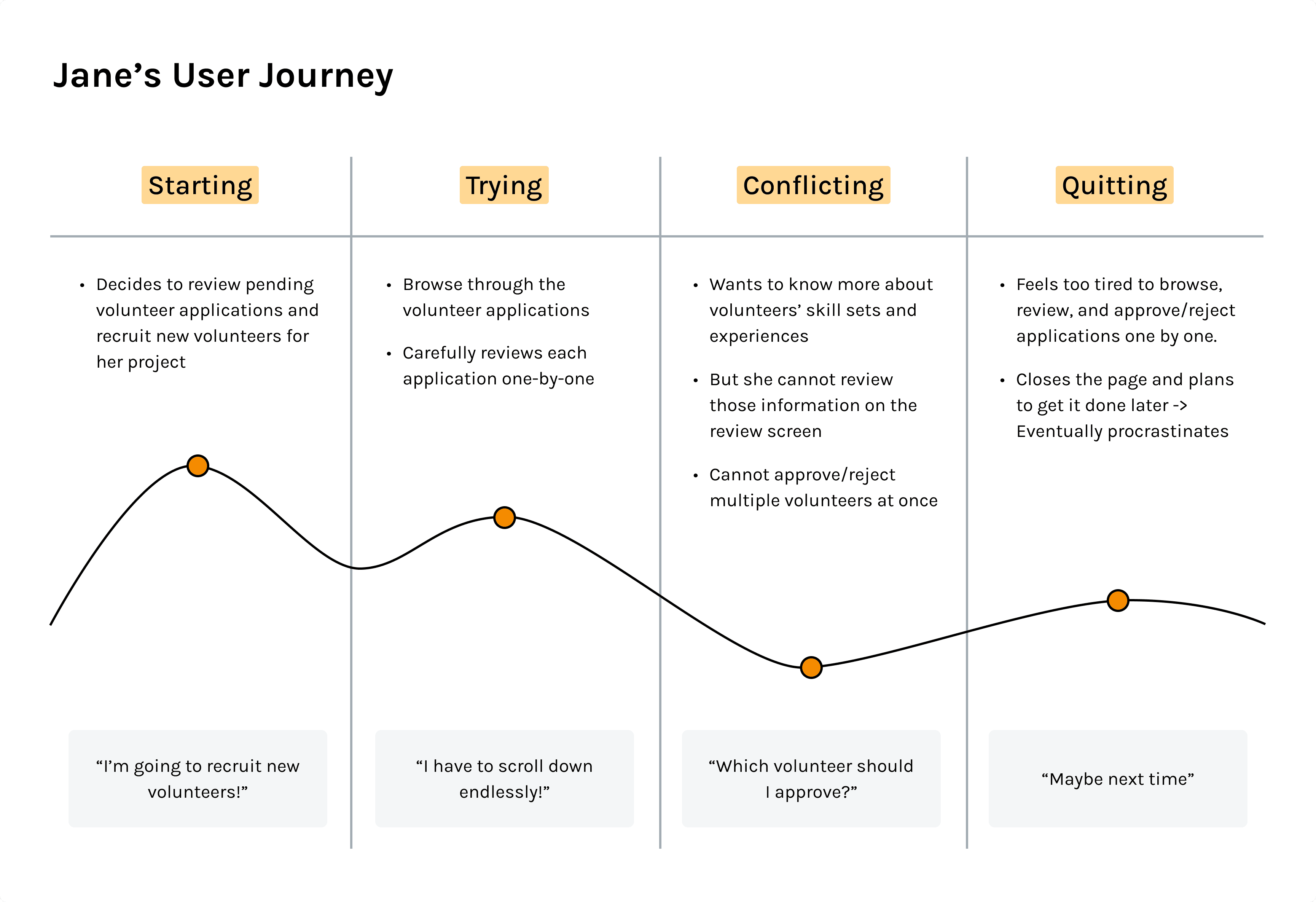 Before ideating features to address the HMW questions, I created a persona (Jane) to guide my design proceess and provide stakeholders with a clear representation of our users and their needs. I also mapped out Jane’s user journey in the original volunteer application management flow to better empathize with users and understand their experience.