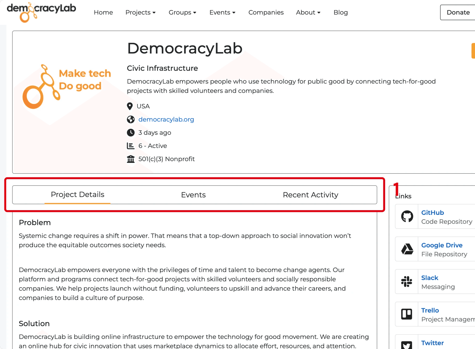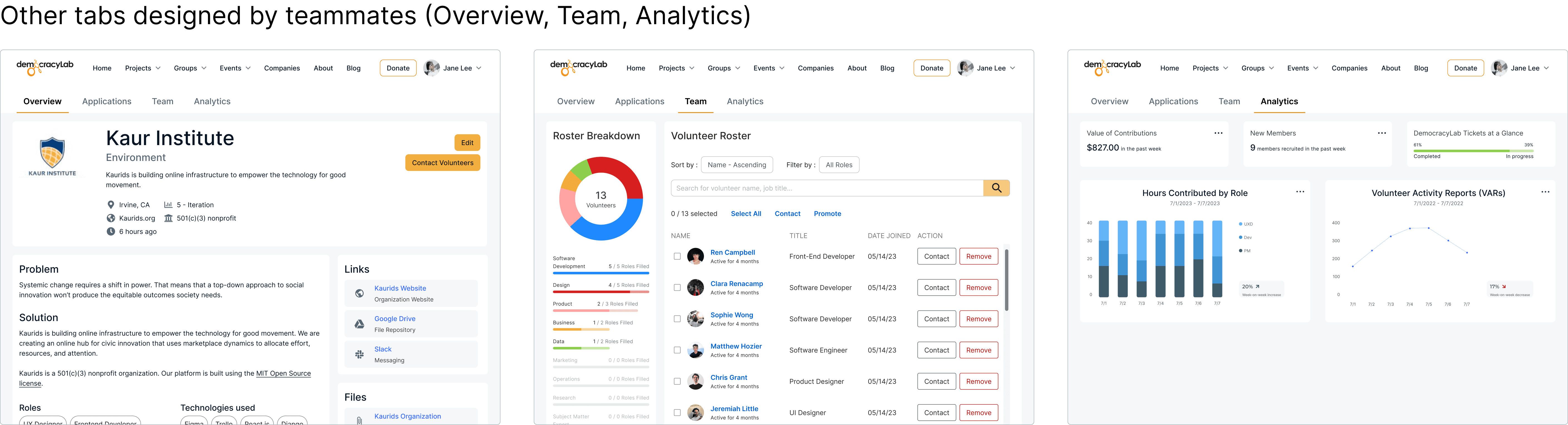 Our Design team + Product Manager met with Mark, DemocracyLab’s Executive Director and a Project Owner who actively uses the platform himself. He highlighted issues with the navigation and flow of project pages, making it difficult to manage volunteer applications and projects. Citing website analytics and his own experience, he emphasized the need for a Project Management Tool (PMT) to streamline these processes. Below were the original screens: